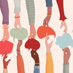 Multi-ethnic community concept. Diversity of people. Communication between multicultural and multiracial people. Social network concept. Sharing of ideas and information